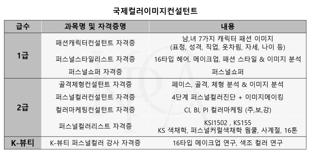상위전문가 국제컬러이미지컨설턴트 이미지전략가 1. 국제컬러이미지컨설턴트 전문가 과정 퍼스널컬러 이후, 이미지를 설계하는 상위 전문가 과정 국제컬러이미지컨설턴트 과정은퍼스널컬러 진단을 기반으로이미지·스타일·브랜딩 영역까지 확장된 컨설팅 역량을완성하는 KPCA 최고 단계의 전문가 양성 과정입니다.본 과정은 퍼스널컬러 컨설턴트 이후 단계에서개인·브랜드·콘텐츠를 아우르는이미지 컨설팅 전문가로 활동하고자 하는 분들을위해 설계되었습니다. 2. 과정 대상 퍼스널컬러를 넘어 ‘이미지 컨설팅’을 업으로 하고 싶은 사람 국제컬러이미지컨설턴트로 활동하고하는 예비·현업 전문가퍼스널컬러컨설턴트 이후 상위 전문 과정을 찾는 분이미지·패션·스타일·브랜딩 분야로 커리어 확장을 원하는 분국내·해외(K-Beauty) 활동을 목표로 하는 전문가 3. 과정 단계 국제컬러이미지컨설턴트 전문가 성장 구조 기본 컨설턴트 │ 국제컬러이미지컨설턴트 2급(퍼스널컬러 이론과 색채 체계를 기반으로이미지·패션·스타일 영역의 기초 컨설팅 구조를 완성하는 단계) 전문 컨설턴트 │ 국제컬러이미지컨설턴트 1급이미지 분석, 스타일 전략, 컬러 응용을 통해개인·브랜드 이미지를 설계하는 상위 컨설턴트 단계) 글로벌 과정 │ K-Beauty 퍼스널컬러 강사외국인 대상 퍼스널컬러·K-Beauty 콘텐츠를교육·강의·컨설팅할 수 있는 글로벌 전문가 과정 4. 취득 자격 국제컬러이미지컨설턴트 1급 취득 시 국제컬러이미지컨설팅 자격 패키지 동시 취득 국제컬러이미지컨설턴트 1급국제컬러이미지컨설턴트 2급퍼스널컬러리스트컬러마케팅컨설턴트퍼스널컬러컨설턴트골격체형컨설턴트퍼스널쇼퍼퍼스널스타일리스트패션캐릭터컨설턴트K-Beauty 퍼스널컬러 강사(개별) ※ 자격증 발급비 별도 5. 이 과정 이후 가능한 활동 영역 국제컬러이미지컨설턴트퍼스널컬러 & 이미지컨설팅 전문가퍼스널컬러 진단샵 및 이미지 컨설팅 샵 운영대학·아카데미·기업 출강화장품·패션·뷰티 브랜드 협업 및 취업K-Beauty 글로벌 강사 활동 6. 수강 안내 국제컬러이미지컨설턴트 2급 : 288만원 (8주X3H=24H)(이미지 컨설턴트 기초 및 색채·퍼스널컬러확장 과정) 국제컬러이미지컨설턴트 1급 : 288만원 (8주X3H=24H)(이미지 전략·스타일·브랜딩 중심의상위 전문가 과정) K-Beauty 퍼스널컬러 강사 과정 : 280만원 (4주X5H=20H)(외국인 대상 퍼스널컬러·K-Beauty교육 전문 과정) 과정 상담 : 010-4557-1594국제퍼스널컬러협회