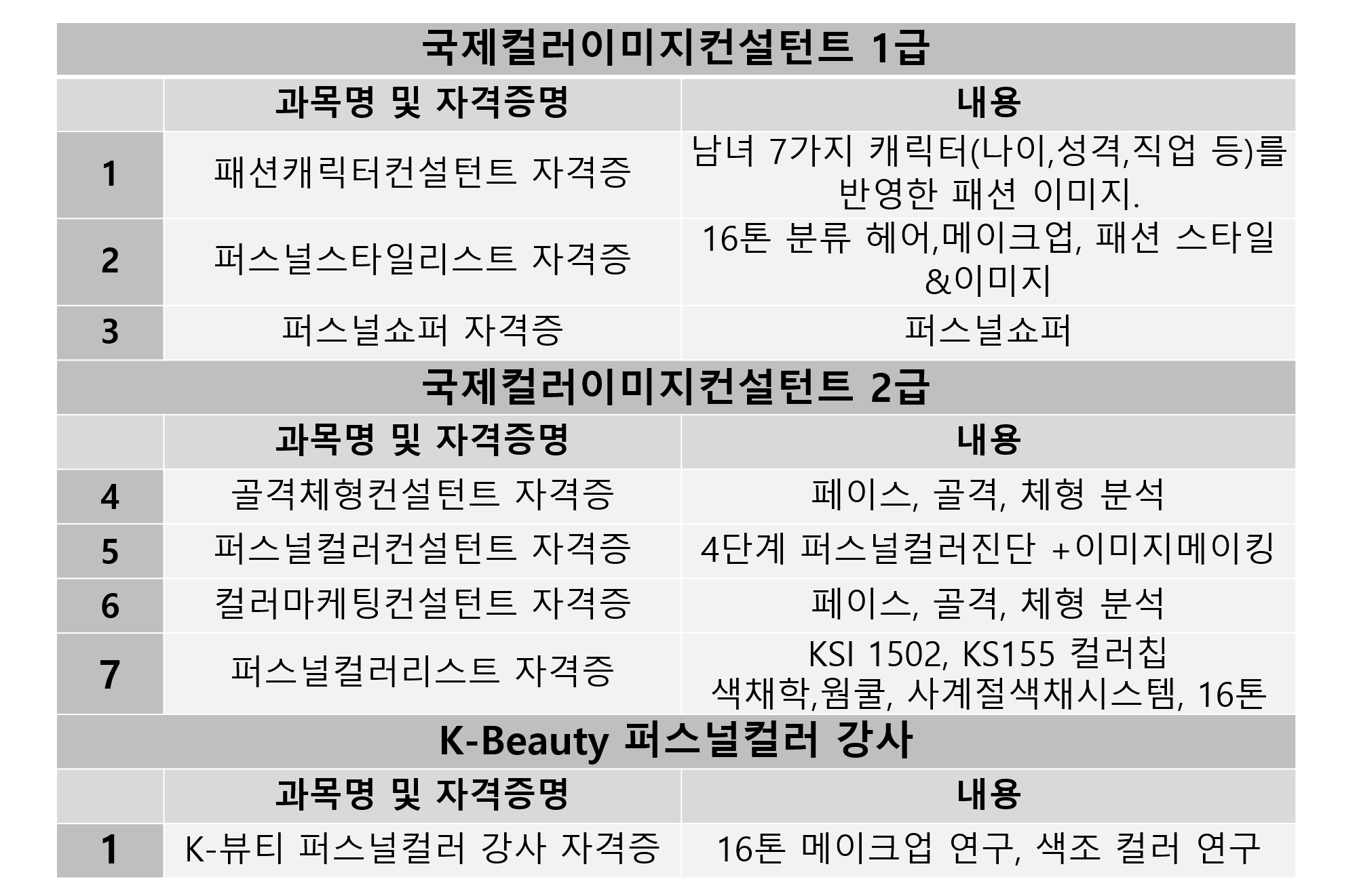 전문가양성 전문가양성과정 국제컬러이미지컨설턴트 1. 전문가양성과정 학생, 이직 혹은 컬러이미지컨설턴트로 활동하고자 분들이 배워 전문가가 되는 국제컬러이미지컨설턴트 양성 과정 *활동영역*퍼스널컬러 컨설턴트K-뷰티 퍼스널컬러강사퍼스널컬러진단 샵 CEO대학출강, 화장품 회사 취업 등 2. 과정 전문컨설턴트 | 국제컬러이미지컨설턴트 1급 기본컨설턴트 | 국제컬러이미지컨설턴트 2급 외국인대상 | K-Beauty 퍼스널컬러 강사 3. 자격증 자격증 Ⅰ. 국제컬러이미지컨설턴트1급Ⅱ. 국제컬러이미지컨설턴트2급Ⅲ. 퍼스널컬러리스트Ⅳ. 퍼스널컬러컨설턴트Ⅴ. 퍼스널스타일리스트Ⅵ. 패션캐릭터컨설턴트Ⅶ. 컬러마케팅컨설턴트Ⅷ. 골격체형컨설턴트Ⅸ. 퍼스널쇼퍼Ⅹ. K-Beauty 퍼스널컬러 강사*국제컬러이미지컨설턴트1급 과정을 취득하시는 분은 추가 9개 자격증 동시 취득.(자격증 발행비는 별도) 4. 교육 프로그램 교육프로그램 5. 대상 국제컬러이미지컨설턴트가 되고자 하는 일반인 6. 비용 비용 국제컬러이미지컨설턴트 1급 : 240만원 (10주X3H=30H)(패션캐릭터, 패션심리, 퍼스널쇼퍼 등 패션 이미지를 심도 있게 배우는 과정) 국제컬러이미지컨설턴트 2급 : 380만원 (16주X3H=48H)(KS색채학의 모든것, 퍼스널컬러 모든것, 색채 및 색조 헤어,메이크업,패션 퍼스널컬러 스타일링 이미지메이킹 모든 것을 배우는 과정) K-Beauty 퍼스널컬러강사 : 280만원 (4주X5H=20H)(퍼스널컬러진단, 16톤 색조 분류, 16톤 메이크업 패턴 연구, 메이크업 컨설팅(브랜드 분류)을 배우는 과정)