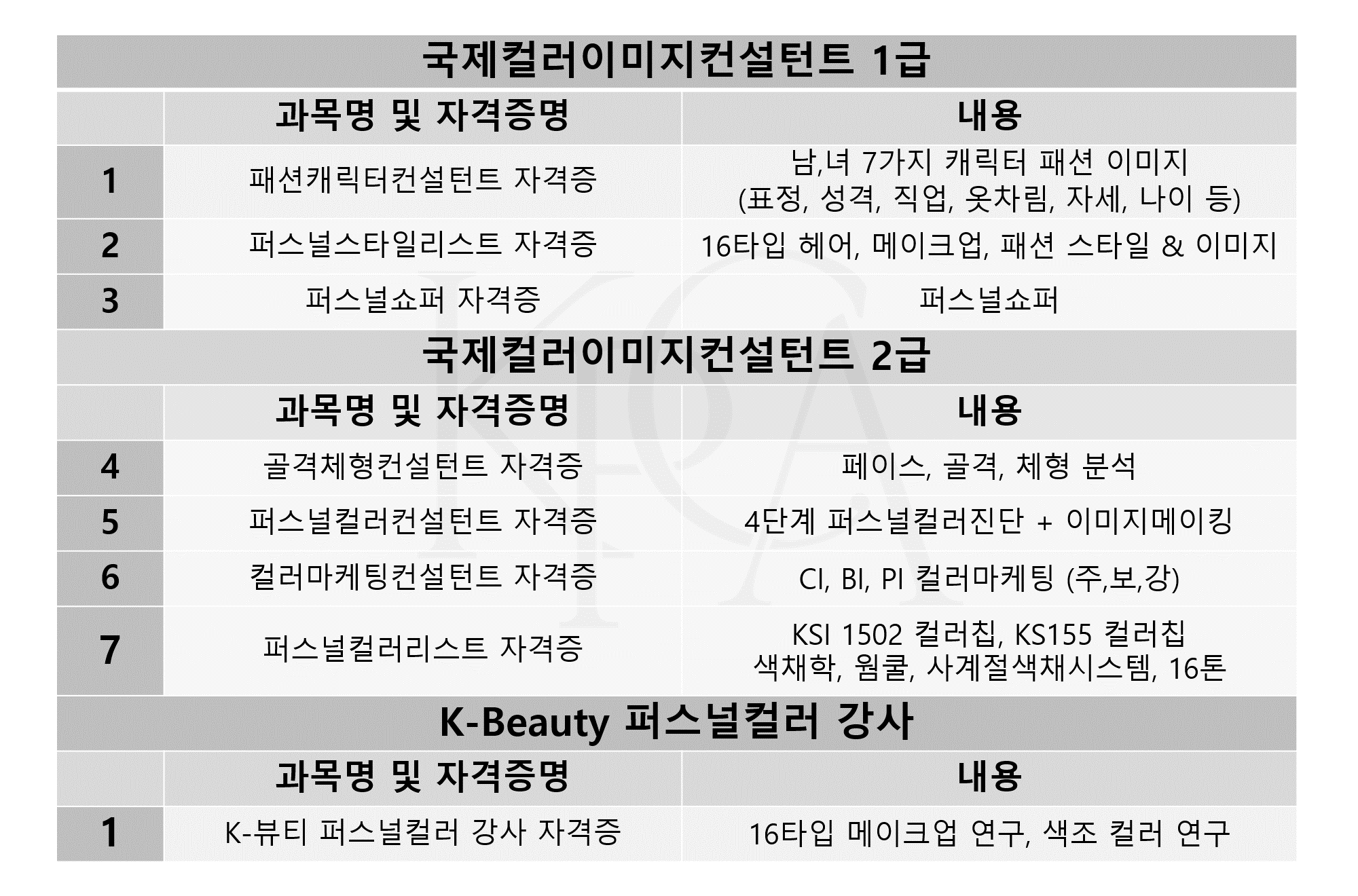전문가과정 전문가양성과정 국제컬러이미지컨설턴트 1. 전문가양성과정 학생, 이직 혹은 컬러이미지컨설턴트로 활동하고자 분들이 배워 전문가가 되는 국제컬러이미지컨설턴트 양성 과정 *활동영역*퍼스널컬러 컨설턴트K-뷰티 퍼스널컬러강사퍼스널컬러진단 샵 CEO대학출강, 화장품 회사 취업 등 2. 과정 전문컨설턴트 | 국제컬러이미지컨설턴트 1급 기본컨설턴트 | 국제컬러이미지컨설턴트 2급 외국인대상 | K-Beauty 퍼스널컬러 강사 3. 자격증 자격증 Ⅰ. 국제컬러이미지컨설턴트1급Ⅱ. 국제컬러이미지컨설턴트2급Ⅲ. 퍼스널컬러리스트Ⅳ. 퍼스널컬러컨설턴트Ⅴ. 퍼스널스타일리스트Ⅵ. 패션캐릭터컨설턴트Ⅶ. 컬러마케팅컨설턴트Ⅷ. 골격체형컨설턴트Ⅸ. 퍼스널쇼퍼Ⅹ. K-Beauty 퍼스널컬러 강사*국제컬러이미지컨설턴트1급 과정을 취득하시는 분은 추가 9개 자격증 동시 취득.(자격증 발행비는 별도) 4. 교육 프로그램 교육프로그램 5. 대상 국제컬러이미지컨설턴트가 되고자 하는 일반인 6. 비용 비용 국제컬러이미지컨설턴트 1급 : 240만원 (10주X3H=30H)(패션캐릭터, 패션심리, 퍼스널쇼퍼 등 패션 이미지를 심도 있게 배우는 과정) 국제컬러이미지컨설턴트 2급 : 380만원 (16주X3H=48H)(KS색채학의 모든것, 퍼스널컬러 모든것, 색채 및 색조 헤어,메이크업,패션 퍼스널컬러 스타일링 이미지메이킹 모든 것을 배우는 과정) K-Beauty 퍼스널컬러강사 : 280만원 (4주X5H=20H)(퍼스널컬러진단, 16톤 색조 분류, 16톤 메이크업 패턴 연구, 메이크업 컨설팅(브랜드 분류)을 배우는 과정)