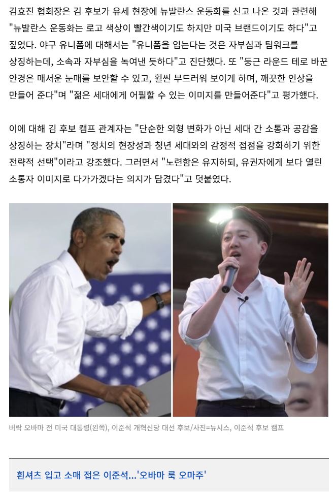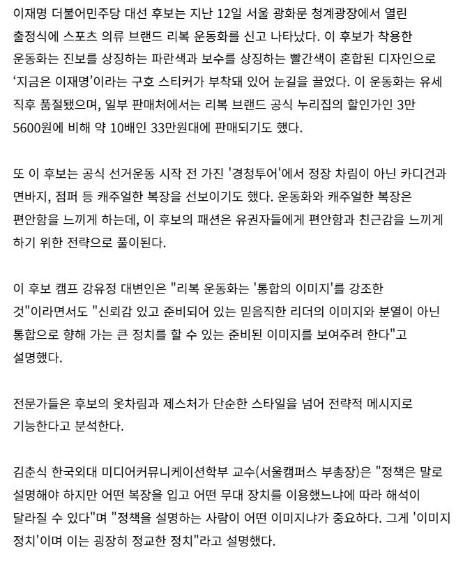 그는 이 후보의 리복 운동화에 대해 “중립을 내포했다”고 평가했다.