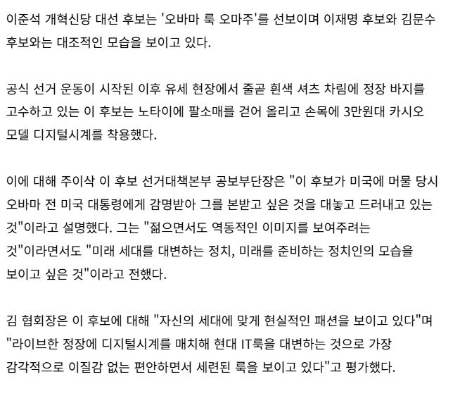 아울러 ‘경청투어’ 당시 이 후보의 카디건과 면바지 차림에 대해서는 “말하는 사람을 고려한 복장”이라며 “상대에게 편하게 이야기하라는 배려의 모습이 담겨있다”고 분석했다.